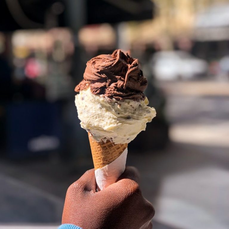 handgemachtes Eis mit ständig wechselnde Sorten wie Salz-Karamel oder Heidelbeer-Lavendel, Kuchen und Kaffeegetränke